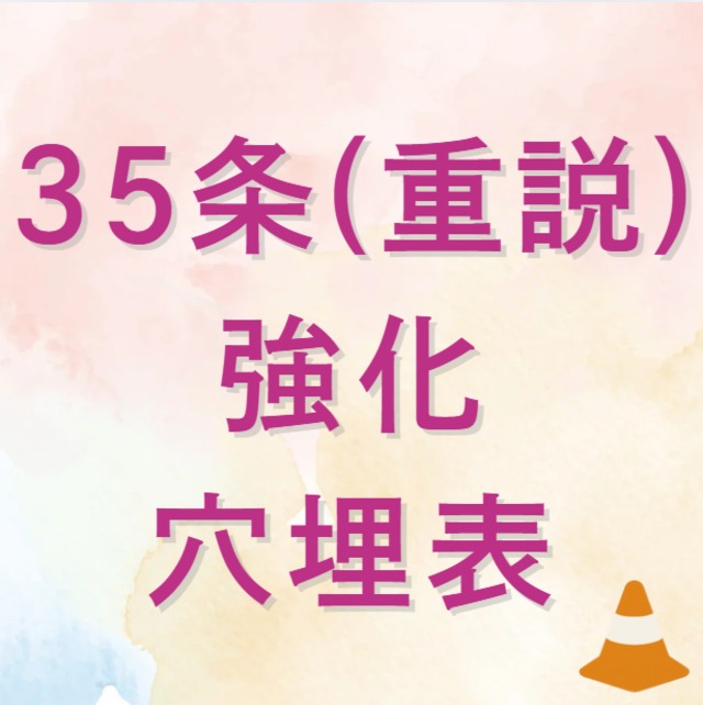 35条書面強化表 製作テーマは 【受験生時代の自分が使いたいもの】 これを意識してつくりました。 実際に今年(制作時)自分で過去問題解きながらよく間違えてたポイントや細かいポイントを入れ込んだものになります[応用編] 暗記シートアプリで併用すると隙間時間の有効活用ができます。 印刷して赤シートで隠しながら解いても使えると思います。